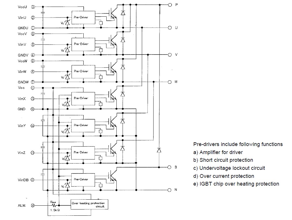 7MBP75RA120-05 absolute maximum ratings: (1)DC bus voltage, VDC: 900V; (2)DC bus voltage (surge), VDC(surge): 1000V; (3)DC bus voltage (short operating), VSC: 800V; (4)Collector-Emitter voltage, VCES: 1200V; (5)DB Reverse voltage, VR: 1200V; (6)Junction temperature, Tj: 150℃; (7)Input voltage of power supply for Pre-Driver, VCC: 20V; (8)Input signal voltage, Vin: VzV; (9)Input signal current, Iin: 1mA; (10)Alarm signal voltage, VALM: VccV; (11)Alarm signal current, IALM: 15mA; (12)Storage temperature, Tstg: -40 to 125℃; (13)Operating case temperature, Top: -20 to 100℃.